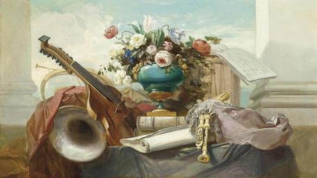 Keywords: Godefroy Violin and other instruments 1862.jpg A violin bagpipes a drum a score of music and an ormolu-mounted vase with roses and other flowers on a draped ledge Signed and dated Godefroy 62 Oil on canvas 69 x 120 cm Christie's online 5488585 2591 81 1862 žGodefroy <gallery>File Godefroy Lute and other instruments 1862 jpg counterpart</gallery> PD-old 1862 paintings 1860s still-life paintings Paintings with signatures Violins in paintings Bagpipes in art Drums in art Music scores in art French horns Still-life paintings of musical instruments Vases in still-life paintings Paintings of musical instruments Paintings with years of production artist 19th-century oil on canvas paintings Still life paintings of flowers |