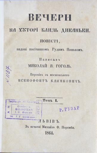Keywords: Gogol Dikanka Evenings 1318.jpg Π ΠΈΠΊΠΎΠ»Π° Π“ΠΎΠ³ΠΎΠ»ΡŒ Π’Π΅Ρ‡Π΅Ρ ΠΈ Π½Π° Ρ…ΡƒΡ‚ΠΎΡ i близь Π”ΠΈΠΊΠ°Π½ΡŒΠΊi Π›ΡŒΠ²Ρ–Π² 1864 Π’ΠΈΡ‚ΡƒΠ»ΡŒΠ½ΠΈΠΉ Π°Ρ ΠΊΡƒΡˆ Π— особистої Π±Ρ–Π±Π»Ρ–ΠΎΡ‚Π΅ΠΊΠΈ Π† Π€Ρ Π°Π½ΠΊΠ° M Gogol/ Dikanka Evenings Lviv 1864 From Ivan Franko personal Library 18864 Institution Shevchenko Institute of Literature Digital Collection PD-old-70-1923 Books published in Lviv Franko Personal Library Collections of books in libraries in Ukraine Shevchenko Institute of Literature Uploaded with VicuΓ±aUploader