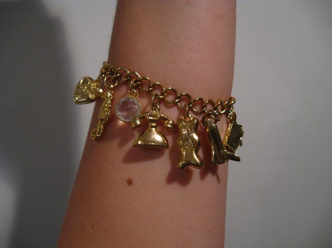 | Keywords: Gold charm bracelet.JPG en A gold charm bracelet worn on the arm Visible charms are a heart-shaped locket seahorse crystal telephone bear spaceship and grand piano own Mabsal 2009-12-27 Public Domain Bracelets Charm bracelets Heart shapes in jewellery |