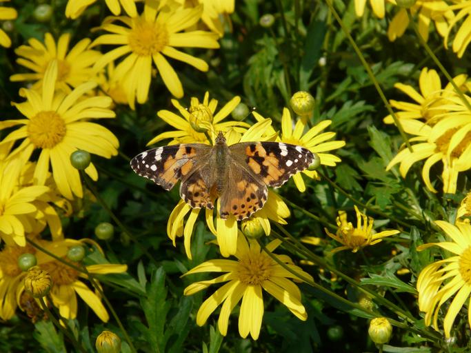 Keywords: gold eye daisy yellow strauchmargerite argyranthemum frutescens tree daisy marguerite yellow flower plant flora blossom bloom bloom summer painted lady vanessa cardui cynthia cardui butterfly edelfalter