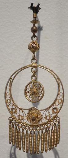 | Keywords: Gold plated silver earing from Morocco or Tunisia, late 19th-early 20th century.JPG en Gold plated silver earring from Morocco or Tunisia late 19th-early 20th century one of pair long-term loan to the Honolulu Museum of Art by Doris Duke Foundation for Islamic Art accession 90 82a-b own Hiart photo 2016 Metalwork in the Doris Duke Foundation for Islamic Art Art of Morocco Art of Tunisia Islamic metalwork in the Honolulu Museum of Art African metalwork in the Honolulu Museum of Art Earrings Cc-zero |