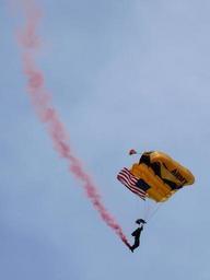 Keywords: Golden Knights-27527-1.jpg A parachutist with the U S Army Parachute Team the Golden Knights glides to earth at the Huntsville International airshow in Madison County AL USA http //www kenthomas us KenThomas us personal website of photographer <br /> Photo taken with a Panasonic Lumix DMC-FZ50 2008-06-28 13 00-05 <sup>ISO 8601</sup> Ken Thomas This image is released to the public domain and therefore no permission or credit is required <br />Comments and/or feedback however are always welcome See my user page for contact info 34 38 33 76 N 86 46 43 76 W heading W Taken with Panasonic Lumix DMC-FZ50 Parafoils United States Army Parachute Team |