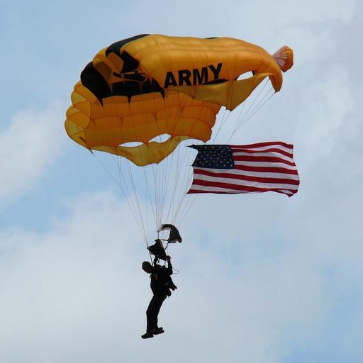 Keywords: Golden Knights-27527-3.jpg A parachutist with the U S Army Parachute Team the Golden Knights glides to earth at the Huntsville International airshow in Madison County AL USA http //www kenthomas us KenThomas us personal website of photographer <br /> Photo taken with a Panasonic Lumix DMC-FZ50 2008-06-28 13 01-05 <sup>ISO 8601</sup> Ken Thomas This image is released to the public domain and therefore no permission or credit is required <br>Comments and/or feedback however are always welcome See my user page for contact info 34 38 33 76 N 86 46 43 76 W heading W Taken with Panasonic Lumix DMC-FZ50 Parafoils Photographs of flags of the United States United States Army Parachute Team |
