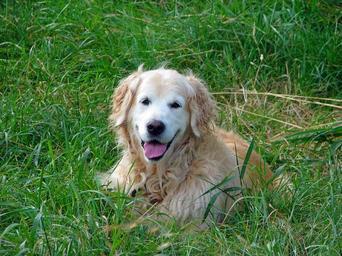 Keywords: golden retriever dog retriever canine pet animal beautiful portrait photo image outdoors laying grass nobody