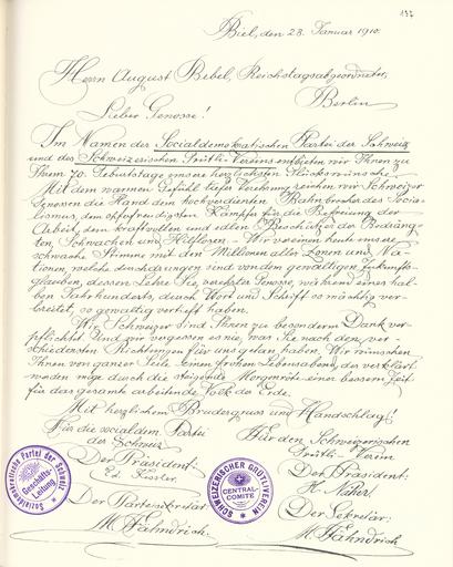 Keywords: Goldenes Buch zum 70. Geburtstag August Bebel 1910 Seite 137.jpg Goldenes Buch zum 70 Geburtstag August Bebel 1910 Seite_ jpg 136 138 Glückwunschschreiben zum 70 Geburtstag von August Bebel Sozialdemokratische Partei der Schweiz und Grütliverein August Bebel zum siebzigsten Geburtstag 22 Februar 1910 / mit einer Nachbemerkung von Ursula Herrmann Reprint des Unikats aus dem Zentralen Parteiarchiv der SED Dietz Verlag Berlin 1989 Lizenzausgabe Saur 1989 ISBN 3-598-07256-2 self scanned from own book 1910 Diverse PD-old-70-1923 Goldenes Buch zum 70 Geburtstag August Bebel 1910 Grütliverein