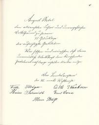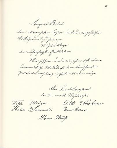 | Keywords: Goldenes Buch zum 70. Geburtstag August Bebel 1910 Seite 040.jpg  Goldenes Buch zum 70 Geburtstag August Bebel 1910 Seite_ jpg 039 041 Glückwunschschreiben zum 70 Geburtstag von August Bebel SPD-Landesvorstand Mecklenburg August Bebel zum siebzigsten Geburtstag 22 Februar 1910 / mit einer Nachbemerkung von Ursula Herrmann Reprint des Unikats aus dem Zentralen Parteiarchiv der SED Dietz Verlag Berlin 1989 Lizenzausgabe Saur 1989 ISBN 3-598-07256-2 self scanned from own book 1910 Diverse Goldenes Buch zum 70 Geburtstag August Bebel 1910 PD-old-70-1923 |