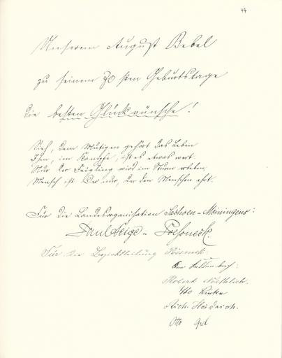 | Keywords: Goldenes Buch zum 70. Geburtstag August Bebel 1910 Seite 047.jpg Goldenes Buch zum 70 Geburtstag August Bebel 1910 Seite_ jpg 046 048 Glückwunschschreiben zum 70 Geburtstag von August Bebel SPD-Landesorganisation Sachsen-Meiningen August Bebel zum siebzigsten Geburtstag 22 Februar 1910 / mit einer Nachbemerkung von Ursula Herrmann Reprint des Unikats aus dem Zentralen Parteiarchiv der SED Dietz Verlag Berlin 1989 Lizenzausgabe Saur 1989 ISBN 3-598-07256-2 self scanned from own book 1910 Diverse Goldenes Buch zum 70 Geburtstag August Bebel 1910 PD-old-70-1923 |
