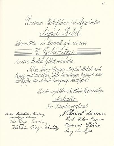| Keywords: Goldenes Buch zum 70. Geburtstag August Bebel 1910 Seite 048.jpg  Goldenes Buch zum 70 Geburtstag August Bebel 1910 Seite_ jpg 047 049 Glückwunschschreiben zum 70 Geburtstag von August Bebel SPD-Landesorganisation Anhalt August Bebel zum siebzigsten Geburtstag 22 Februar 1910 / mit einer Nachbemerkung von Ursula Herrmann Reprint des Unikats aus dem Zentralen Parteiarchiv der SED Dietz Verlag Berlin 1989 Lizenzausgabe Saur 1989 ISBN 3-598-07256-2 self scanned from own book 1910 Diverse Goldenes Buch zum 70 Geburtstag August Bebel 1910 PD-old-70-1923 |