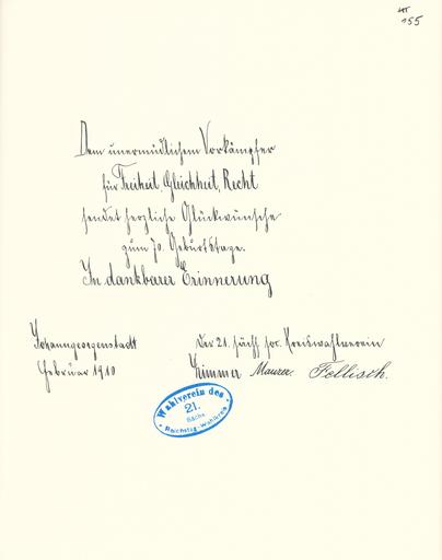 | Keywords: Goldenes Buch zum 70. Geburtstag August Bebel 1910 Seite 155.jpg  Goldenes Buch zum 70 Geburtstag August Bebel 1910 Seite_ jpg 154 156 Glückwunschschreiben zum 70 Geburtstag von August Bebel SPD-Kreisorganisation des 21 Sächsischen Reichstagswahlkreises Johanngeorgenstadt August Bebel zum siebzigsten Geburtstag 22 Februar 1910 / mit einer Nachbemerkung von Ursula Herrmann Reprint des Unikats aus dem Zentralen Parteiarchiv der SED Dietz Verlag Berlin 1989 Lizenzausgabe Saur 1989 ISBN 3-598-07256-2 self scanned from own book 1910 Diverse Goldenes Buch zum 70 Geburtstag August Bebel 1910 PD-old-70-1923  |