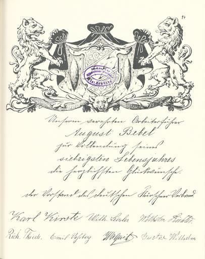 | Keywords: Goldenes Buch zum 70. Geburtstag August Bebel 1910 Seite 084.jpg  Goldenes Buch zum 70 Geburtstag August Bebel 1910 Seite_ jpg 083 085 Glückwunschschreiben zum 70 Geburtstag von August Bebel Vorstand des Deutschen Kürschner-Verbandes August Bebel zum siebzigsten Geburtstag 22 Februar 1910 / mit einer Nachbemerkung von Ursula Herrmann Reprint des Unikats aus dem Zentralen Parteiarchiv der SED Dietz Verlag Berlin 1989 Lizenzausgabe Saur 1989 ISBN 3-598-07256-2 self scanned from own book 1910 Diverse PD-old-70-1923 Goldenes Buch zum 70 Geburtstag August Bebel 1910 |
