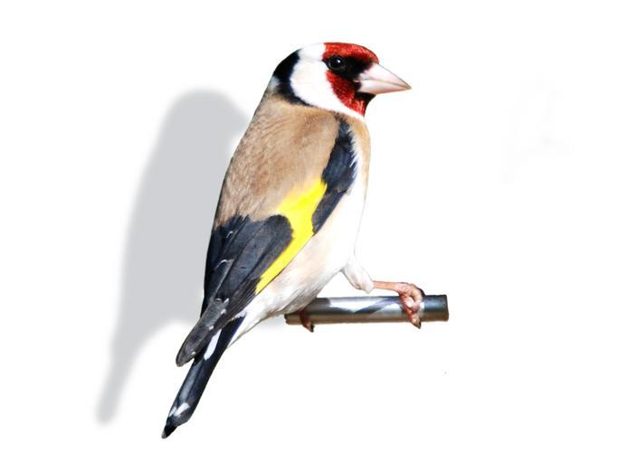 | Keywords: Goldfinch back.jpg  en Photograph of Goldfinch Background edited out to emphasize wing markings Own Meon 03/06/2008 Photograph taken in Hamptworth Wiltshire UK Camera Nikon D80 Lens Sigma 50-500mm f/13 1/640 sec ISO 400 Carduelis carduelis captive Birds on white background Hamptworth |