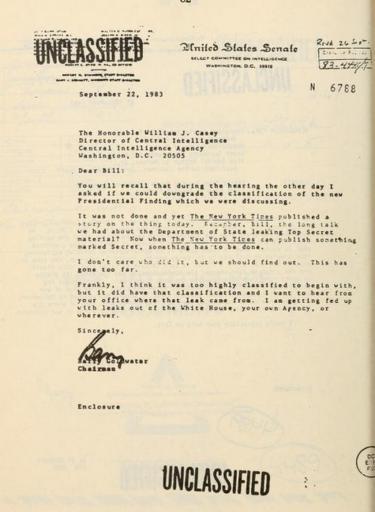 Keywords: Goldwater casey nyt leak.png en Memo from Senator Barry Goldwater to Director of Central Intelligence CIA William J Casey in 1983 complaining about leaking of classified documents to the New York Times Text <pre> Dear Bill You will recall that during the hearing the other day I asked if we could downgrade the classification of the new Presidential Finding which we were discussing It was not done and yet The New York Times published a story on the thing today Remember Bill the long talk we had about the Department of State leaking Top Secret material Now when The New York Times can publish something marked Secret something has to be done I don't care who did it but we should find out This has gone too far Frankly I think it was too highly classified to begin with but it did have that classification and I want to hear from your office where that leak came from I am getting fed up with leaks out of the White House your own Agency or wherever </pre> From Report of the congressional committees investigating the Iran-Contra Affair with supplemental minority and additional views Published 1987 by U S House of Representatives Select Committee to Investigate Covert Arms Transactions with Iran U S Senate Select Committee on Secret Military Assistance to Iran and the Nicaraguan Opposition For sale by the Supt of Docs U S G P O in Washington http //www archive org/stream/reportofcongress0187unit page/81/mode/1up Barry Goldwater senator 1983 PD-USGov CIA documents New York Times Barry Goldwater William J Casey |
