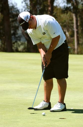 Keywords: golfer golfing green putting putter club ball course grass tournament competition game sport outdoors man play recreation activity fairway shot swing hit flag hole trees nature view