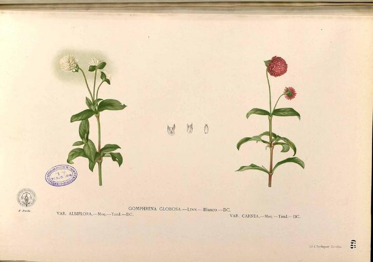 Keywords: Gomphrena globosa Blanco1.68-original.png Plate from book Flora de Filipinas Gran edicion Atlas I http //bibdigital rjb csic es 1880-1883 Francisco Manuel Blanco O S A PD-old <gallery> File Gomphrena globosa Blanco1 68-original png Original File Gomphrena globosa Blanco1 68 png Cleaned colors adjusted -- png File Gomphrena globosa Blanco1 68 jpg Cleaned colors adjusted -- jpg File Gomphrena globosa Blanco1 68-cropped jpg Cleaned colors adjusted cropped </gallery> <gallery> File Gomphrena globosa Blanco1 68-albiflora png Gomphrena globosa var albiflora File Gomphrena globosa Blanco1 68-carnea png Gomphrena globosa var carnea </gallery> Flora de Filipinas Gomphrena globosa - botanical illustrations