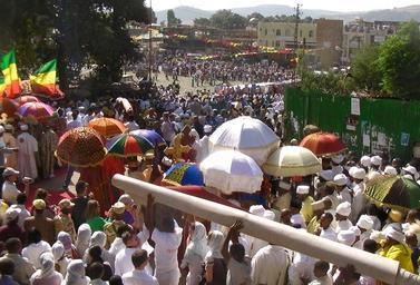 | Keywords: Gondar procession.JPG Gondar Ethiopia sits on something of forested hill just northeast of the Royal Enclosure which is home to Fasiladas' Palace The Enclosure is off camera to the left as this view is from the hotel grounds looking mostly west and slightly south at 3 pm local time on one of the days of the Timkat festival which is the Ethiopian church's celebration of Epiphany Note that as the priests continue along the red carpet it is rolled up behind them and carried to the front of the procession own Brian Dell 2011-01-18 Cc-zero 12 610425 37 470613 region ET_heading WSW Gondar Timkat Processions in Ethiopia Red carpets Orthodox cross processions Orthodox deacons 2011 in Ethiopia |