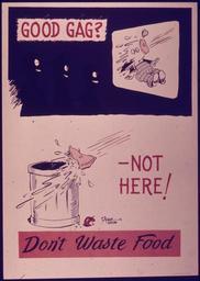 Keywords: "Good Gag^ Not Here^ Don't Waste Food" - NARA - 514414.jpg Scope and content General notes 514414 Local identifier 44-PA-909 Office for Emergency Management Office of War Information Domestic Operations Branch Bureau of Special Services 03/09/1943 - 09/15/1945 Still Picture Records Section Special Media Archives Services Division NWCS-S National Archives at College Park 8601 Adelphi Road College Park MD 20740-6001 1941 - 1945 Record group Record Group 44 Records of the Office of Government Reports 1932 - 1947 Record group ARC 373 World War II Posters compiled 1942 - 1945 Series ARC 513498 File unit File unit ARC Variant control numbers NAIL Control Number NWDNS-44-PA-909 Other versions <gallery> File Good_Gag _Not_Here _Don't_Waste_Food _-_NARA_-_514414 tif tif File Good_Gag _Not_Here _Don't_Waste_Food _-_NARA_-_514414 jpg jpg </gallery> NARA-cooperation PD-USGov World War II posters from the United States USA WWII food waste avoidance propaganda |
