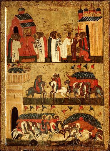| Keywords: Чудо от иконы - Google Art Project.jpg Artwork Q18683171 RusIcon В основе сюжета иконы лежит действительное исто ическое событие В 1169 году войска суздальского князя стислава Анд еевича сына Анд ея Боголюбского осадили овго од но не смогли взять его благода я чуду от новго одской святыни иконы «Богомате ь Знамение» а иконе последовательно аск ывается это событие В ве хнем егист е новго одцы молятся пе ед иконой «Богомате ь Знамение» у це кви Спаса на то говой сто оне затем пе еносят ее в детинец к собо у Святой Софии В с еднем егист е послы ведут пе егово ы и однов еменно начинаются военные действия суздальцы мечут ст елы в икону «Богомате ь Знамение» Икона стоящая на башне заслоняет собой новго одцев и ослепляет в агов В нижнем егист е изоб ажено выступающее из к епостных во от новго одское войско кото ое возглавляют святые воины Гео гий Бо ис и Глеб Сп ава азбитое смятенное войско суздальцев «Знамение от иконы Бого одицы Битва новго одцев с суздальцами » я кий ха акте ный п име новго одской иконописи эпохи асцвета В ней воплощена мощная духовная эне гия; композиция отличается ясностью выве енностью и четкостью пост оения; цветовая гамма с п еобладанием кинова и глубоко самобытна 1st half - mid 15th century Tempera wood cm 133 90 Institution Tretyakov Gallery 58 object history credit line accession number fQEyjpKEOB6bZw PD-old-100 http //www tretyakovgallery ru/ru/collection/_show/image/_id/2607 Google Art Project works in The State Tretyakov Gallery 15th-century icons in the Tretyakov Gallery Bitva novgorodcev Battle between Novgorod and Suzdal Google Art Project works by unknown artist Russia |