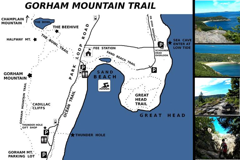 | Keywords: gorham mountain gorhammountain the beehive thebeehive sand beach sandbeach anemone cave anemonecave sea cave seacave caves acadis national park acadisnationalpark thunder hole thunderhole great head trail greatheadtrail maps of acadia mapsofacadia abandoned trails abandonedtrails lost trails losttrails ghost trails ghosttrails phantom trails phantomtrails cartoon outdoor Some call Gorham Mountain the mountain of many caves, and like Champlain and Day Mountain, there are a number of caves on Gorham mountain. Most of the caves are old Indian caves and in areas where you can't see them from the main hiking trails. There are great views of Sand Beach as you make your way to the summit, not to mention great views of the ocean and the Beehive. In the summer months expect to come upon small groups of people picking wild Maine blueberries along the sides of the trail. The map also shows the location of Thunder Hole and Anemone Cave, but don't expect to see any signs for the cave as it has been abandoned by the Park Service. This sea cave can only be entered at low tide. Some call Gorham Mountain the mountain of many caves, and like Champlain and Day Mountain, there are a number of caves on Gorham mountain. Most of the caves are old Indian caves and in areas where you can't see them from the main hiking trails. There are great views of Sand Beach as you make your way to the summit, not to mention great views of the ocean and the Beehive. In the summer months expect to come upon small groups of people picking wild Maine blueberries along the sides of the trail. The map also shows the location of Thunder Hole and Anemone Cave, but don't expect to see any signs for the cave as it has been abandoned by the Park Service. This sea cave can only be entered at low tide. |