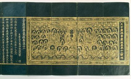 | Keywords: Goryeo-Avatamsaka Sutra.vo.12-mid.14c.Leeum.Museum.jpg Avatamsaka Sutra vol 12 화엄경 華嚴經 12권 frontispiece in gold and silver text on indigo blue paper W 12 3/8 in x H 4 5/8 in each fold Ho-Am Art Museum http //www asianart com/exhibitions/korea/14 html mid 14th century author PD-old Paintings of the Goryeo Dynasty Buddhist paintings from Korea Ho-Am Art Museum Goryeo Buddhist paintings | ||||