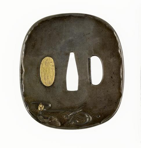 | Keywords: Gotô Ichijô - Tsuba with a Lotus Pond - Walters 51176 - Back.jpg This tsuba depicts a lotus pond with lotus flowers blossoming The plants are depicted in gold and silver relief On the back of the tsuba a water bug skims the water between the lotus The lotus is associated with Buddha and a state of purity The construction of this tsuba is unusual The front is made of a copper and gold alloy called shakudo while the back is silver They have been fused together creating a wavy pattern along the tsuba's edge between 1824 1862 late Edo silver shakudo gold copper at center cm 6 9 6 13 0 34 accession number 51 176 4515 Henry Walters Baltimore date and mode of acquisition unknown Walters Art Museum Henry Walters Acquired by Henry Walters Signature Goto Hokkyo/Ichijo kao place of origin Edo present-day Tokyo Japan Walters Art Museum license Tsuba in the Walters Art Museum Gotô Ichijô Media contributed by the Walters Art Museum needs category review |