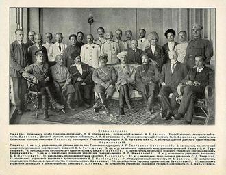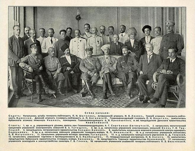 | Keywords: Government of South Russia 1920.JPG en The Government of South Russia Crimea Sevastopol 1920 Sitting from left to right 1 - Chief of Staff Major General P N Shatilov; 2 - Astrakhan Ataman N V Lyakhov; 3 - Terek Ataman Lieutenant General G A Vdovenko; 4 - Don Ataman Lieutenant General A P Bogaevsky; 5 Сommander- in-Chief of the Russian Army General P N Wrangel; 6 - Deputy Kuban Ataman engineer V N Ivanis; 7 - Assistant of Сommander- in-Chief Head of Government A V Krivoshein; 8 Acting Chairman of the Don Government Korzhenevskiy Standing from left to right 1 Acting Director of Council Affairs by Сommander- in-Chief A G Sergeenko-Bogokutskiy; 2 Chief of Political Office of the Department of Foreign Affairs B A Tatishchev; 3 Acting Director of Foreign Affairs Prince G N Trubetskoy; 6 - Chairman of the Astrakhan Government Sanji-Bayanov; 8 - Deputy Chief of the Naval Department Counter Admiral S V Evdokimov; 9 Acting Chief of the Military Department Major General V P Nikolskiy; 10 Acting Head of Finance B V Matusevich; 11 - Head of the Department of Justice Senator N N Tagantsev; 12 Acting Director of the Civil Department S D Tverskoy; 13 - Head of the Department of Trade and Industry V S Nalbandov; 14 - State Comptroller N V Savich; 15 - Vice-Chairman of the Kuban Government Major General I A Zakharov; 16 - Chairman of the Terek Government Bukanovskiy; 17 - Head of the Department of Agriculture and Land Management Senator G V Glinka; 18 - Head of Office Supplies Lieutenant General P E Vilchevskiy ru П авительство Юга России К ым Севастополь 1920 Сидят слева нап аво 1 - начальник штаба гене ал-майо П Шатилов; 2 - Аст аханский атаман В Ляхов; 3 - Те ский атаман гене ал-лейтенант Г А Вдовенко; 4 - Донской атаман гене ал-лейтенат А П Богаевский; 5 - Главнокомандующий Русской а мией гене ал П В ангель; 6 заместитель Кубанского атамана инжене В Иванис; 7 помощник Главнокомандующего глава П авительства А В К ивошеин; 8 и об П едседателя Донского п авительства Ко женевский Стоят слева нап аво 1 в и д уп авляющего делами совета п и Главнокомандующем А Г Се геенко-Богокутский; 2 - начальник политической канцеля ии Уп авления иност анных сношений Б А Татищев; 3 - вp и д начальника Уп авления иност анных сношений князь Г Т убецкой; 6 - п едседатель Аст аханского п авительства Санджи-Баянов; 8 - заместитель начальника о ского уп авления конт -адми ал C B Евдокимов; 9 - вp и д начальника Военного уп авления гене ал-майо В П икольский; 10 - и д начальника Уп авления финансов Б В атусевич; 11 - начальник Уп авления юстиции сенато Таганцев; 12 - и д начальника Г ажданского уп авления С Д Тве ской; 13 - начальник уп авления то говли и п омышленности B C албандов; 14 - госуда ственный конт олё В Савич; 15 - заместитель п едседателя Кубанского п авительства гене ал-майо И А Заха ов; 16 - п едседатель Те ского п авительства Букановский; 17 начальник Уп авления земледелия и землеуст ойства сенато Г В Глинка; 18 - начальник Уп авления снабжений гене ал-лейтенант П Э Вильчевский http //vadimus58 livejournal com/ here /здесь unknown / неизвестно 1920 120px PD-old White Russians Pyotr Nikolayevich Wrangel Papakhi Civil war of Russia in Crimea Civil war of Russia 1920 Afrikan Bogayevsky |