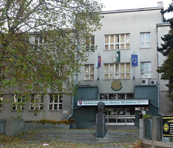 Keywords: GPHMI.jpg sk Budova Gymnázia Pavla Horova v Michalovciach Na schodisku busta Pavla Horova own Martin Nedelsky 2010-10-31 Masarykova Michalovce Arpád Račko Pamätník Pavla Horova