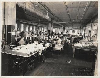 Keywords: kalamazoo public library michigan history photography workers women factory manufacturing interior machines sew sewing corset grace Interior of Grace Corset Company, the sewing room. Original caption reads, "Grace Corset Company. Sewing room with 125 girls at machines. Some machines equipped with two needles which are capable of taking 3000 stitches per minute. Output: 100 dozen per day." The Kalamazoo Corset Company was renamed the Grace Corset Company in 1922. For more information about the corset industry in Kalamazoo read: www.kpl.gov/local-history/business/kalamazoo-corset.aspx KPL catalogue number P-100. Interior of Grace Corset Company, the sewing room. Original caption reads, "Grace Corset Company. Sewing room with 125 girls at machines. Some machines equipped with two needles which are capable of taking 3000 stitches per minute. Output: 100 dozen per day." The Kalamazoo Corset Company was renamed the Grace Corset Company in 1922. For more information about the corset industry in Kalamazoo read: www.kpl.gov/local-history/business/kalamazoo-corset.aspx KPL catalogue number P-100.