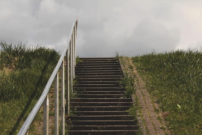 Keywords: gradually stairs dike grass railing metal cold clouds freedom