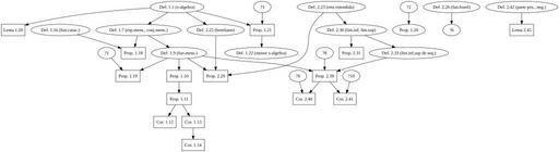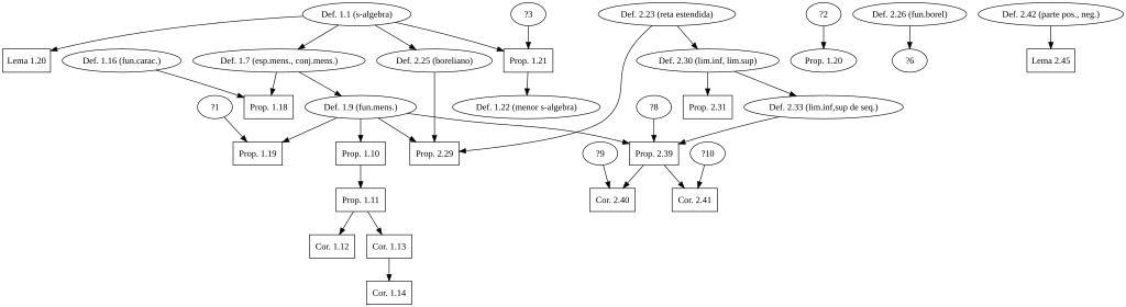 | Keywords: Grafo mostrando dependência entre definições e resultados de Medida.svg  Medida e integração feita com o http //www graphviz org/License php Graphviz Trata-se de um grafo ilustrando a dependência entre conceitos e resultados da Teoria da Medida Um conceito ou resultado é usado em outro se houver um caminho uma sequência de setas de mesma orientação ligando o primeiro ao segundo own Helder 10/02/2010 Código fonte digraph G / Mensurabilidade http //pt wikibooks org/w/index php oldid 137444 / Def 1 1 s-algebra -> Def 1 7 esp mens conj mens ; Def 1 7 esp mens conj mens -> Def 1 9 fun mens ; Prop 1 10 shape box; Def 1 9 fun mens -> Prop 1 10 ; Prop 1 11 shape box; Prop 1 10 -> Prop 1 11 ; Cor 1 12 shape box; Prop 1 11 -> Cor 1 12 ; Cor 1 13 shape box; Prop 1 11 -> Cor 1 13 ; Cor 1 14 shape box; Cor 1 13 -> Cor 1 14 ; Prop 1 18 shape box; Def 1 16 fun carac -> Prop 1 18 ; Def 1 7 esp mens conj mens -> Prop 1 18 ; Prop 1 19 shape box; Def 1 9 fun mens -> Prop 1 19 ; 1 -> Prop 1 19 ; Lema 1 20 shape box; Def 1 1 s-algebra -> Lema 1 20 2 -> Prop 1 20 ; Prop 1 21 shape box; Def 1 1 s-algebra -> Prop 1 21 3 -> Prop 1 21 Prop 1 21 -> Def 1 22 menor s-algebra / A reta real estendida http //pt wikibooks org/w/index php oldid 138910 / Def 2 23 reta estendida -> Def 2 30 lim inf lim sup ; Def 1 1 s-algebra -> Def 2 25 boreliano ; Def 2 26 fun borel -> 6 ; Prop 2 29 shape box; Def 1 9 fun mens -> Prop 2 29 ; Def 2 23 reta estendida -> Prop 2 29 ; Def 2 25 boreliano -> Prop 2 29 ; Prop 2 31 shape box; Def 2 30 lim inf lim sup -> Prop 2 31 ; Def 2 30 lim inf lim sup -> Def 2 33 lim inf sup de seq Prop 2 39 shape box; Def 1 9 fun mens -> Prop 2 39 ; Def 2 33 lim inf sup de seq -> Prop 2 39 ; 8 -> Prop 2 39 ; Cor 2 40 shape box; Prop 2 39 -> Cor 2 40 ; 9 -> Cor 2 40 ; Cor 2 41 shape box; Prop 2 39 -> Cor 2 41 ; 10 -> Cor 2 41 ; Lema 2 45 shape box; Def 2 42 parte pos neg -> Lema 2 45 Measure theory Graphs graph theory |