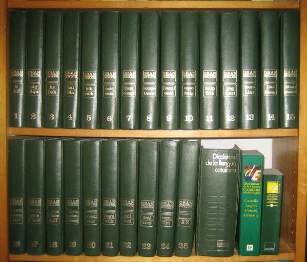 | Keywords: Gran Enciclopèdia Catalana.jpg en The 25 volumes of Gran Enciclopèdia Catalana translation Great Catalan Encyclopedia This version is the first reimpression at april 1988 from the second edition at june 1986 which is from the first edition of the Encyclopedia at july 1969 This is the main catalan source of knowledge printed in paper edited a lot of times until now 2009 On the right down corner there are the Diccionari de la Llengua Catalana translation Dictionary of the Catalan Language and the Diccionari de la Llengua Catalana Multilingüe Castellà Anglès Francès Alemany translation Dictionary of the Catalan Language Multilingual Spanish English French German this with the new label's non-profit publishing company Fundació Enciclopèdia Catalana Catalan Encyclopedia Foundation The last book is a smaller version of the dictionary ca Són els 25 volums de la Gran Enciclopèdia Catalana Aquesta versió és la primera reimpressió de l'abril de 1988 la qual era reimpresa de la segona edició de juny de 1986 la qual al seu torn venia de la primera edició de l'Enciclopèdia l'abril de 1969 Aquesta és la major font catalana de coneixement impresa en paper editada moltes voltes fins a dia d'avui any 2009 Al cantó inferior a la dreta hi ha el Diccionari de la Llengua Catalana i el Diccionari de la Llengua Catalana Multilingüe Castellà Anglès Francès Alemany aquest últim amb el nou logo de l'entitat editora sense ànim de lucre la Fundació Enciclopèdia Catalana L'últim dels llibres és una versió més petita del diccionari es Son los 25 volúmenes de la Gran Enciclopèdia Catalana traducción Gran Enciclopedia Catalana Esta es la versión de la primera reimpressión de abril de 1988 la cual era reimpresa de la segunda edición de junio de 1986 la cual provenia de la primera edición de la Enciclopedia de abril de 1969 Esta es la fuente catalana de conocimiento mas grande imprimida en papel editada muchas veces hasta la fecha año 2009 En el rincón inferior derecho hay el Diccionari de la llengua catalana traducción Diccionario de la lengua catalana y el Diccionari de la llengua Catalana Multilingüe Castellà Anglès Francès Alemany traducción Diccionario de la Lengua Catalana Multilingue Castellano Inglés Francés Alemán ese último con la nueva marca de la entidad editora sin ánimo de lucro la Fundació Enciclopèdia Catalana Fundación Enciclopedia Catalana El último libro es una versión del diccionario más pequeña own Galazan 13 d'abril de 2009 La fotografia és meva i la cedeixo lliurement a qui vulgui utilitzar-la It is my own work and I give it to everybody Barcelona Països Catalans Hardcover spines Spines of encyclopedias Encyclopedias of Catalonia Catalan language encyclopedias Grup Enciclopèdia Catalana |