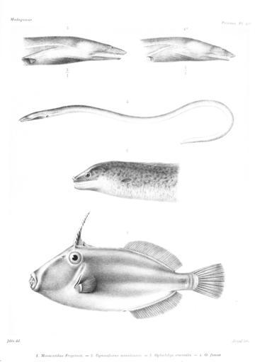 Keywords: GrandidierMadagascarFishes 0131.jpg Monacanthus freycineti now Meuschenia freycineti Gymnothorax mauritianus now Gymnothorax flavimarginatus Ophichthys orientalis now Lamnostoma orientalis Ophichthys fuscus Ophichthus sp fish name has changed please help retrieve the current one Histoire Physique Naturelle et Politique de Madagascar Volume 16 Histoire Naturelle des Poissons atlas http //www archive org/details/histoirephysique16gran web 1885 text Alfred Grandidier 1836-1921 artists various Jobin pd-old-70 Alfred Grandidier Histoire Physique Naturelle et Politique de Madagascar - Grandidier - Volume 16 Poissons Meuschenia freycineti Gymnothorax flavimarginatus Lamnostoma orientalis Ophichthus Unidentified Ophichthidae |
