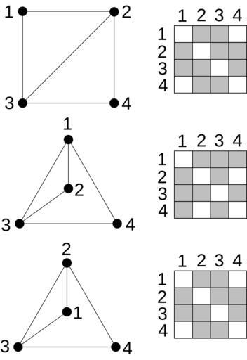 | Keywords: Graph isomorphism.svg A demonstration of graph isomorphism Three graphs the complete graph on 4 vertices <math>K_4</math> minus an edge are shown with their line-point diagrams and adjacency matrices The top and middle graphs look different and have different matrices but in fact they are isomorphic since the vertices of the middle graph can be relabelled to obtain the bottom graph which has exactly the same adjacency matrix as the top graph own 2007-05-13 Dcoetzee Graph theory | ||||
