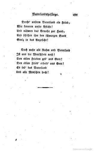 Keywords: Gräter Das teutsche Schützenlied 3.png Das teutsche Schützenlied in Friedrich David Gräter Lyrische Gedichte nebst einigen vermischten Heidelberg 1809 S 185 http //books google com/books id mFxJAAAAYAAJ pg PA185 1797/1809 Friedrich David Gräter <gallery> File Gräter Das teutsche Schützenlied 1 png Datei 1 S 183 File Gräter Das teutsche Schützenlied 2 png Datei 2 S 184 File Gräter Das teutsche Schützenlied 3 png Datei 3 S 185 </gallery> PD-old-100 De Wikisource book |