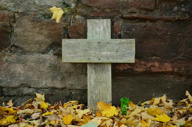 Keywords: grave animal grave mourning cross death autumn leaves fall foliage wall stone die hope
