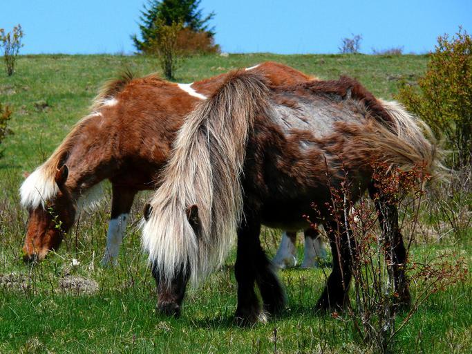 MAKE A MEME View Large Image Grayson Highlands Ponies-27527-3.jpg A pair of ponies feed in the grass These are members of an introduced herd of wild ponies that has lived on the balds of Wilburn Ridge in Grayson Highlands State Park for over 50 years <br />Photo taken ...