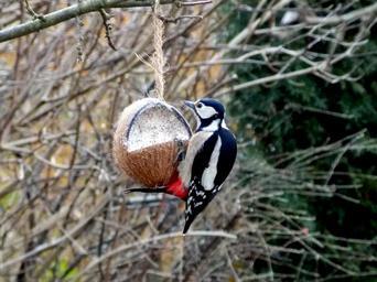 Keywords: great spotted woodpecker woodpecker bird nature forest animal garden colorful spring dress feather wing schnabelm bird feeding stuffed coconut feeding