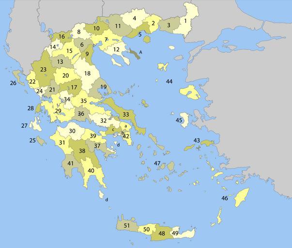 | Keywords: Greece prefectures numbered.png Greece prefectures numbered 1 Evros ομός Έβρου 2 Xanthi ομός Ξάνθης 3 Rodopi ομός Ροδό ης 4 Drama ομός Δράμας 5 Kavala ομός Καβάλας 6 Imathia ομός Ημαθίας 7 Thessaloniki ομός Θεσσαλονίκης 8 Kilkis ομός Κιλκίς 9 Pella ομός Πέλλας 10 Pieria ομός Πιερίας 11 Serres ομός Σερρών 12 Chalkidiki ομός Χαλκιδικής 13 Grevena ομός Γρεβενών 14 Kastoria ομός Καστοριάς 15 Kozani ομός Κοζάνης 16 Florina ομός Φλώρινας 17 Karditsa ομός Καρδίτσας 18 Larisa ομός Λάρισας 19 Magnisia ομός αγνησίας 20 Trikala ομός Τρικάλων 21 Arta ομός Άρτας 22 Thesprotia ομός Θεσ ρωτίας 23 Ioannina ομός Ιωαννίνων 24 Preveza ομός Πρέβεζας 25 Zakynthos ομός Ζακύνθου 26 Corfu/Kerkyra ομός Κέρκυρας 27 Kefallinia ομός Κεφαλληνίας 28 Lefkada ομός Λευκάδας 29 Etoloakarnania ομός Αιτωλοακαρνανίας 30 Achaia ομός Αχαΐας 31 Elis/Ilia ομός Ηλείας 32 Boeotia/Viotia ομός Βοιωτίας 33 Euboea/Evvia ομός Εύβοιας 34 Evrytania ομός Ευρυτανίας 35 Fthiotida ομός Φθιώτιδας 36 Fokida ομός Φωκίδας 37 Argolis ομός Αργολίδας 38 Arcadia ομός Αρκαδίας 39 Korinthia ομός Κορινθίας 40 Lakonia ομός Λακωνίας 41 Messinia ομός εσσηνίας 42 Attica ομός Αττικής a East Attica ομαρχία Ανατολικής Αττικής b Athens ομαρχία Αθηνών c West Attica ομαρχία Δυτικής Αττικής d Piraeus ομαρχία Πειραιά 43 Lesvos ομός Λέσβου 44 Samos ομός Σάμου 45 Chios ομός Χίου 46 Dodecanese ομός Δωδεκανήσου 47 Cyclades ομός Κυκλάδων 48 Iraklio ομός Ηρακλείου 49 Lasithi ομός Λασιθίου 50 Rethymno ομός Ρεθύμνου 51 Chania ομός Χανίων A Athos Άγιο Όρος Own 2007-12-22 Pitichinaccio Maps of prefectures of Greece Maps numbering |