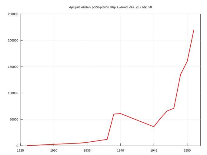 | Keywords: Greece-radio-users-mid-20s-early-50s.svg en Number of radios in Greece from mid 20s to early 50s Source cite book Χαιρετάκης ανώλης Η ραδιοφωνία στην Ελλάδα 1930-1950 2014 Έκδοση του ραδιοφωνικού σταθμού 105 5 FM Στο Κόκκινο Αθήνα 978-618-81169-3-1 2015-06-04 own CubicStar other versions cc-zero Created with Gnuplot Gnuplot script to generate this plot <source lang gnuplot > Terminal set terminal svg enhanced size 800 600 set output greece-radio-users-mid-20s-early-50s svg Data and formats set datafile missing - set datafile separator whitespace set xdata time set timefmt Y set format x Y Scale and ranges set autoscale set xrange 1925 1952 set yrange 0 250000 Ticks borders and title set border 0 set xtics 1925 1930 1935 1940 1945 1950 1955 nomirror set ytics autofreq nomirror set grid xtics linetype 1 linewidth 1 linecolor rgb efefef set grid ytics linetype 1 linewidth 1 linecolor rgb efefef Background set object 1 rectangle \ from graph 0 graph 0 to graph 1 graph 1 \ behind \ fillcolor rgb ffffff \ fillstyle solid 1 0 Inline data data << EOData 1926 200 1927 800 1934 5000 1935 6317 1938 12000 1939 60000 1940 61000 1945 36000 1946 52000 1947 66000 1948 71000 1949 135000 1950 160000 1951 220000 EOData set title Αριθμός δεκτών ραδιοφώνου στην Ελλάδα δεκ 20 - δεκ 50 plot data using 1 2 with lines lw 2 5 linecolor rgb e41a1c title </source> Uploaded with UploadWizard Gnuplot diagrams Radio of Greece |