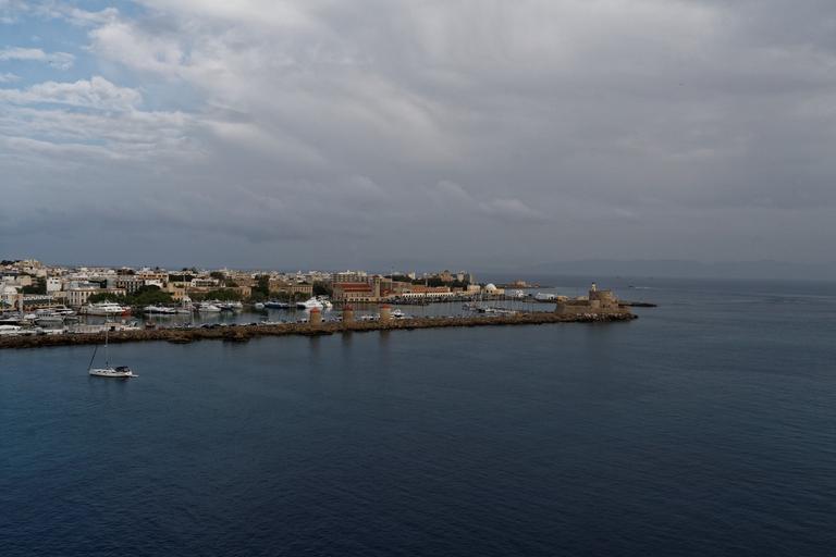 Keywords: greece rhodes castle city homes fortress city gate goal wall tower port sea water sky architecture coast harbour entrance