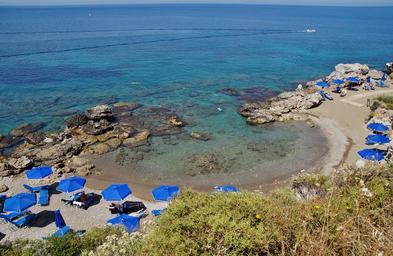Keywords: greece rodos kallithea bay beach lounge chairs sun umbrellas rocky