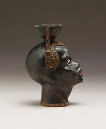 | Keywords: Greek - Aryballos in the Form of Head of an African - Walters 482017 - Right Side.jpg This aryballos is in the shape of an African head It has a hemispherical mouth with a straight support rectangular in section on either side The mouth is glazed black outside and inside and is painted with red over black on top of the rim The supports are painted black on three sides and red over black on the outside The body is painted black The back of the head is smooth the lips are red the irises of the eyes are white the interior of the ears are white and red Added clay dots for the hair are painted red with slight traces of white The piece has an oval base with a reserved underside and a red band on the outside at the bottom of the vessel There is not another head vase known quite like this one The date of the vase is difficult to determine for the form of the mouth and its supports are typical of examples from the late archaic but the modelling of the face in respect to style is not far removed from the work of Sotades who was active around 460-450 BC ca 480 430 BC Classical terracotta H overall 3 5/8 x W 1 13/16 x D 2 9/16 in 9 2 x 4 65 x 6 55 cm ; Diam at mout cm 3 1 ; Diam at mouth with supports cm 3 8 ; W at base 1 3/16 x D 1 1/4 in 2 95 x 3 15 cm accession number 48 2017 4096 Joseph Brummer New York date and mode of acquisition unknown Joseph Brummer Sale New York 1949 Pt III no 2 Walters Art Museum 1949 by purchase Museum purchase 1949 place of origin Attica Greece Walters Art Museum license Ancient Greek pottery in the Walters Art Museum Ancient Greek pottery aryballoi Africans in ancient Greek art Media contributed by the Walters Art Museum needs category review Attic red-figure pottery |