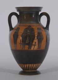 Keywords: Greek - Black-Figure Amphora - Walters 4813 - Side B.jpg This vase may portray the common departure scene of two warriors in full armor leaving home for war or it may represent a famous scene from The Iliad in which Priam king of Troy comes to claim and pay ransom for the body of his son Hector Achilles who killed Hector in single combat greets the elderly king Witnessing this scene are a second warrior who stands next to Achilles and another man standing behind ca 520 510 BC Archaic terracotta cm 32 3 20 5 accession number 48 13 10431 Don Marcello Massarenti Collection Rome no 231 Henry Walters city Baltimore Walters Art Museum Henry Walters Acquired by Henry Walters with the Massarenti Collection 1902 place of origin Athens Greece Walters Art Museum license Ancient Greek black-figure pottery in the Walters Art Museum Achilles in ancient Greek pottery Ransom of Hector Media contributed by the Walters Art Museum needs category review
