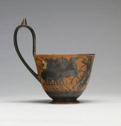 | Keywords: Greek - Black-figure Kyathos - Walters 48219 - Side A.jpg This kyathos depicts a characteristic battle scene two warriors or heroes fighting over a fallen soldier Two bearded soldiers attack each other with raised spears and large shields decorated with white motifs and red rims Their swords hang sheathed at their side The warrior on the left has knocked his opponent's helmet off his head while his opponent's spear is pointing at his throat In between a third warrior has collapsed on his right knee and uses his spear and shield for support Unlike the standing fighters in their short skirts he wears a short white garment belted with a bow On either side of this central scene a warrior with a shield is driving to the right in a quadriga a four-horse chariot Without identifying attributes or inscriptions the warriors depicted could be ordinary soldiers in battle or Greek heroes fighting at Troy The scene of two warriors fighting over the body of a fallen soldier is a familiar episode from accounts of the Trojan War; the recovery of the body and the armor of a dead comrade was crucial Even if the warriors depicted on this vessel are ordinary Greeks the imagery recalls the glory of the heroic warriors of the past ca 510 BC Archaic terracotta H with handle 5 11/16 x W with handle 5 3/8 in 14 4 x 13 6 cm ; H to rim 3 3/16 x Diam 4 1/8 in 8 1 x 10 4 cm accession number 48 219 7599 Ercole Canessa date and mode of acquisition unknown Sale Galerie Georges Petit 1921 no 36 Sale American Art Galleries 1924 no 52 Dikran Kelekian New York and Paris date and mode of acquisition unknown Henry Walters Baltimore date of acquisition unknown by purchase Walters Art Museum Henry Walters Acquired by Henry Walters Heroes Mortals and Myths in Ancient Greece The Walters Art Museum Baltimore; Frist Center for the Visual Arts Nashville; San Diego Museum Of Art San Diego; Alexander S Onassis Public Benefit Foundation USA New York 2009-2011 place of origin Attica Greece Walters Art Museum license Ancient Greek black-figure pottery in the Walters Art Museum Art from Greece Quadriga Horses in ancient Greek pottery Ancient Greek kyathoi |