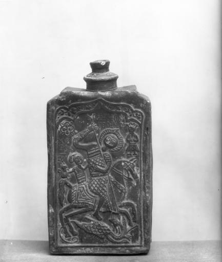 Keywords: Greek - Flask with an Image of Saint George Killing the Dragon - Walters 551.jpg Such lead silver or tin flasks for brandy were manufactured in large quantities for Christians in the late Ottoman Empire The saints depicted on them were meant to protect the owner Images of Saint George were particularly popular Here the saint's name is accompanied by the abbreviation IC XC Jesus Christ the name Joseph probably the owner's and on the other side above the head of the irder seated behind St George the word Hadji meaning for Christians one who has made a pilgrimage to Jerusalem century 18 Modern lead cm 18 8 9 8 accession number 55 1 7787 Dikran Kelekian New York and Paris date and mode of acquisition unknown Henry Walters city Baltimore Walters Art Museum Henry Walters Acquired by Henry Walters 1912 place of origin Balkan Peninsula Walters Art Museum license Medieval art in the Walters Art Museum Art from Greece Reliefs of Saint George and the Dragon Media contributed by the Walters Art Museum needs category review |