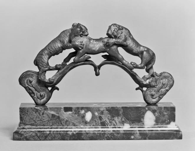 | Keywords: Greek - Handle Depicting a Lion and a Tigress Attacking a Bull - Walters 54872.jpg Echoing the monumental Archaic sculpture of the Acropolis of Athens this image symbolized power and domination A lion and a tigress attack a bull which has been brought to its knees The animals' eyes are inlaid with silver The group would have served as the handle of an elaborate bronze bowl 400-30 BC Classical bronze with silver inlay cm 7 9 15 1 2 4 ; mount cm 3 1 16 2 4 5 accession number 54 872 25527 Dikran Kelekian New York and Paris date and mode of acquisition unknown Henry Walters city Baltimore Walters Art Museum Henry Walters Acquired by Henry Walters 1911 place of origin Greece Walters Art Museum license Ancient Greek art in the Walters Art Museum Art from Greece Media contributed by the Walters Art Museum needs category review |