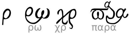 Keywords: Greek minuscule Rho with ligatures.svg en Samples of ligatures involving Greek letter Rho in medieval minuscule handwriting and early modern printing own based on glyphs in the Rgreekl2 font made by Vernon Kooy http //schmidhauser us/tools/rgl/rgreekl2 pdf Fut Perf 2010-08-14 Rho letter Greek ligatures ρ |