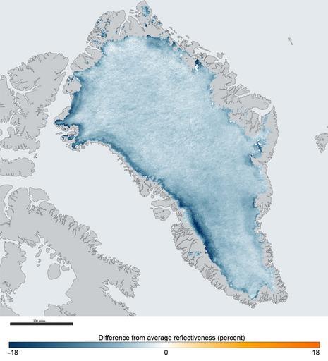 | Keywords: Greenland Albedo Change.png Greenland reflected in the summer of 2011 versus the average percent it reflected between 2000 to 2006 Virtually the entire ice sheet shows some change with some areas reflecting close to 20 percent less light than a decade ago The map is based on observations from the Moderate Resolution Imaging Spectroradiometer MODIS instruments on NASA ™s Terra and Aqua satellites It was produced as part of the National Oceanic and Atmospheric Administration ™s Arctic Report Card 2012-02-12 http //earthobservatory nasa gov/IOTD/view php id 76916 http //eoimages gsfc nasa gov/images/imagerecords/76000/76916/greenlandalbedo_mod_2011_lrg jpg Map by NOAA ™s climate gov team based on NASA satellite data processed by Jason Box Byrd Polar Research Center the Ohio State University Scanning electron microscope photos courtesy the Electron and Confocal Microscopy Laboratory USDA Agricultural Research Service PD-USGov Uploaded with UploadWizard Glaciology of Greenland Climate change Global warming |