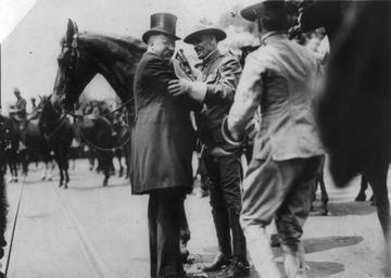 | Keywords: Greeting Col. Brodie of Rough Riders.jpg en Photograph showing Theodore Roosevelt and Col Alexander O Brodie in uniform greeting each other surrounded by horses Library of Congress Prints and Photographs Division Washington D C 20540 USA Call Number PRES FILE - Roosevelt Theodore--Miscellaneous Political and Social Activities item P P Digital ID http //hdl loc gov/loc pnp/cph 3a51448 cph 3a51448 Paul Thompson photographer circa 1910 June 23 Public Domain copyright expired LOC-image cph 3a51448 PD-Art Alexander Brodie Theodore Roosevelt Rough Riders |