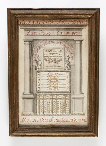 | Keywords: Gregoriansk kalender från år 1720 med veckodagar, månader, skottår, stjärntecken m.m - Skoklosters slott - 93148.tif LSH artwork Erik E son Bergbom sv Rubrik CALENDARIUM PERPETUUM samt religösa deviser Sign Ericus Erici Bergbom Inv del fec Holm 1720 Kalendern består av ett främre pappersark med tre luckor bakom detta pappere en furu platta med fem utskruna hål för tre rullband av papper vilka förflyttas med hjälp av svarvade träknoppar samt två skjutbrickor klädda med blått ylletyg På främre pappret är tecknat en portal flankerad av två doriska kolonner <br/>I tympanon ses t v Moses med lagens tavlor t h Johannes Döparen Mellan dem öppning för rullband med tryckta månads angivelser Rullbandet visar varje månads zodiaktecken antal dagar solens upp- och nedgångar den 1 10 och 20 i månaden genomsnittligt antal natt- och dagtimmar samt Ständige<br/>Fäst- och Märk-dagar tryckta i svart och rött T h om detta rullband en skjubricka med fastsatt papperslapp med 29 vilket alltså anger februaris antal dagar vid skottår Under tympanon på främre bladet är skrivet veckodagarnas namn Söndag med rött vardagarna med guldfärg Daegen planettecken är tecknat t h varje dags benämning Längre åt högre är öppning för rullband med månens faser vars tecken är tryckta i rött och svart Åt vänster öppning för datumrullband bredvid detta rullband finns skjutbricka med papper med datum 1-6 Datumrullbandet ej rubbats vid denna katalogisering <br/>På furuplattans baksida skrivet med bläck Kostar sex plåtar dn 19de December 1721 med tysk stil <br/>Glas på framsida Profilerad bronserad ram 35 mm bred original caption Gregoriansk kalender från år 1720 med veckodagar månader skottår stjärntecken m m <br/> Nyckelord Stjärntecken Almenacka Kalender Veckan Datum Föremålsbild 1720 size mm 298 450 SKO place of origin original filename sm_dig5609 31761 inventory number SKO 10679 93148 CC-BY-SA Fredrik Andersson <gallery caption Different images of same object > File Baksida av gregoriansk kalendarium perpetuum 1720 - Skoklosters slott - 93149 tif </gallery> Almanacs Fredrik Andersson Media contributed by LSH unmatched creator Media contributed by LSH unmatched keyword Media contributed by LSH 2014-11 |