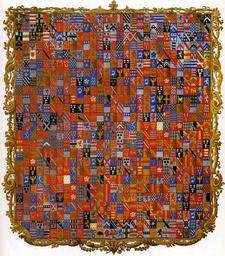 Keywords: Grenville Diptych edit.jpg Edit for WP FPC The Stowe Armorial coat of arms is the centrepiece of the Gothic Library at Stowe http //en wikipedia org/wiki/Stowe_House The Library was commissioned by George Nugent-Temple-Grenville 1st Marquess of Buckingham See Viscount Cobham http //en wikipedia org/wiki/Viscount_Cobham and built to a design by Sir John Soane http //en wikipedia org/wiki/John_Soane between 1805 and 1807 The armorial is a 1 4m diameter heraldic painting of the 719 quarterings of the Temple Nugent Brydges Chandos and Grenville families including ten variations of the English Royal arms the arms of Spencer De Clare Valence Mowbray Mortimer and De Grey The painting is signed and dated P Sonard 1806 <ref>Stowe House Michael Bevington 2002 </ref> Stowe Armorial ou Armorial Grenville à Stowe ; réalisé entre 1822 et 1839 pour Richard Temple-Grenville marquis de Chandos et fils du premier duc de Buckingham et de Chandos afin de mettre en valeur les 719 quartiers de la famille Il est considéré comme exemple extravagant de triage héraldique Ce blasonnement est la pièce maîtresse de la Bibliothèque néogothique de Stowe_House commanditée par George Nugent-Temple-Grenville 1er marquis de Buckingham Voir http //en wikipedia org/wiki/Viscount_Cobham Vicomte Cobham et construit selon les plans de Sir John Soane entre 1805 et 1807 Cet armorial est une peinture héraldique large de 1 4 m des 719 quartiers des familles Temple Nugent Brydges Chandos et Grenville incluant dix variations des armoiries royales anglaises les armes de Spencer de De Clare de Valence de Mowbray de Mortimer et De Grey Cette oeuvre est signée et datée P Sonard 1806 unknown 1806 P Sonard Image is in the public domain because of its age It is more than 150 years old as of 2006 See File Grenville_Diptych jpg File Grenville_Diptych_edit2 jpg PD-old-100 Diptychs Heraldic divisions Paintings of coats of arms Stowe Armorial |